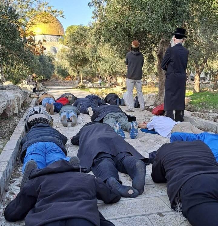 ومن الطقوس التي كرر المقتحمون أداءها أثناء اقتحام الأقصى طقس السجود الملحمي أو الانبطاح على ثرى الأقصى، والنفخ بالبوق، واقتحام المسجد بالزي الكهنوتي، والصلوات التوراتية.