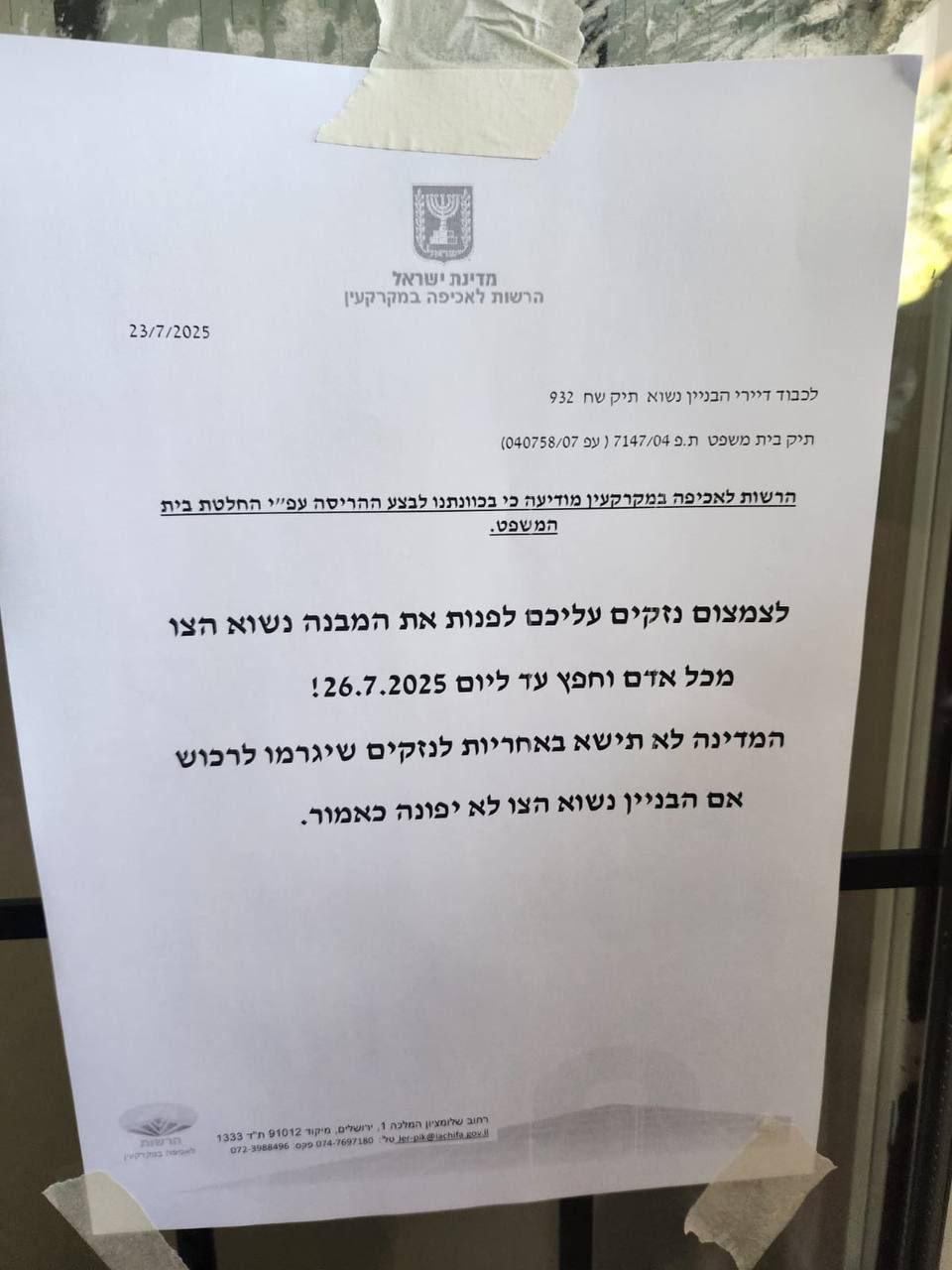 وأفادت محافظة القدس بأن قوات الاحتلال اقتحمت محيط البناية، وسلمت سكانها قرارًا نهائيًا بهدمها، وأمهلتهم حتى يوم السبت المقبل 26 تموز لإخلائها، الأمر الذي سيؤدي إلى تهجير قرابة 100 مقدسي يشكلون 17 عائلة تقطن البناية.