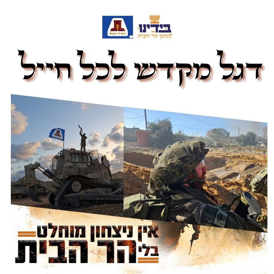 وأطلقت هذه المنظمة حملتها تحت عنوان "راية مقدسة لكل جندي" تأكيدًا لرؤية الصهيونية الدينية و"منظمات الهيكل" للحرب المتواصلة كحرب حسمٍ على كل الجبهات، تنظر فيها إلى تهويد الأقصى كخطٍّ موازٍ للإبادة في غزة.