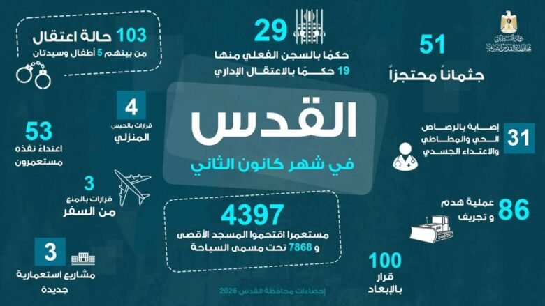 رصدت محافظة القدس انتهاكات الاحتلال الممنهجة في المحافظة خلال شهر كانون الثاني/يناير 2026، وتصدّر الانتهاكات الاعتداءات المتصاعدة على المسجد الأقصى،…